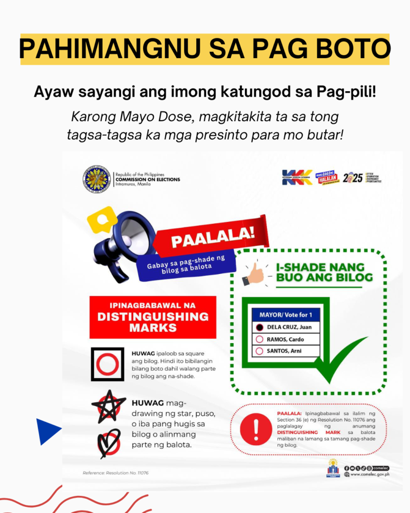 Maayong Adlaw mga KaBarangay sa Tapul, City of Talisay, Cebu! Duha ka adlaw na lng ug mag pinili-ay na pod ta para sa atong National and Local Mid-term Elections karong Mayo 12, 2025. Busa, naa kitay mga pahimangnu o reminders para dili masayang atong pag botar ug walay kakulian ang mahitabo. Magkitakita kita sa atong