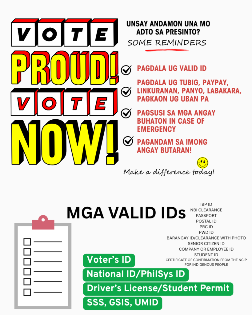 Duha ka adlaw na lng ug mag pinili-ay na pod ta para sa atong National and Local Mid-term Elections karong Mayo 12, 2025. Busa, naa kitay mga pahimangnu o reminders para dili masayang atong pag botar ug walay kakulian ang mahitabo. Magkitakita kita sa atong tagsa tagsa ka mga presinto!